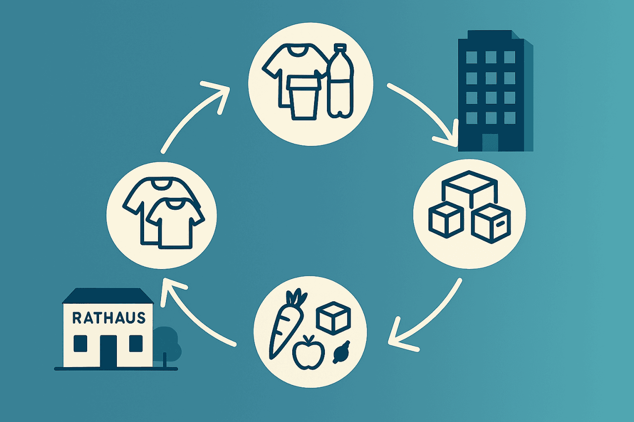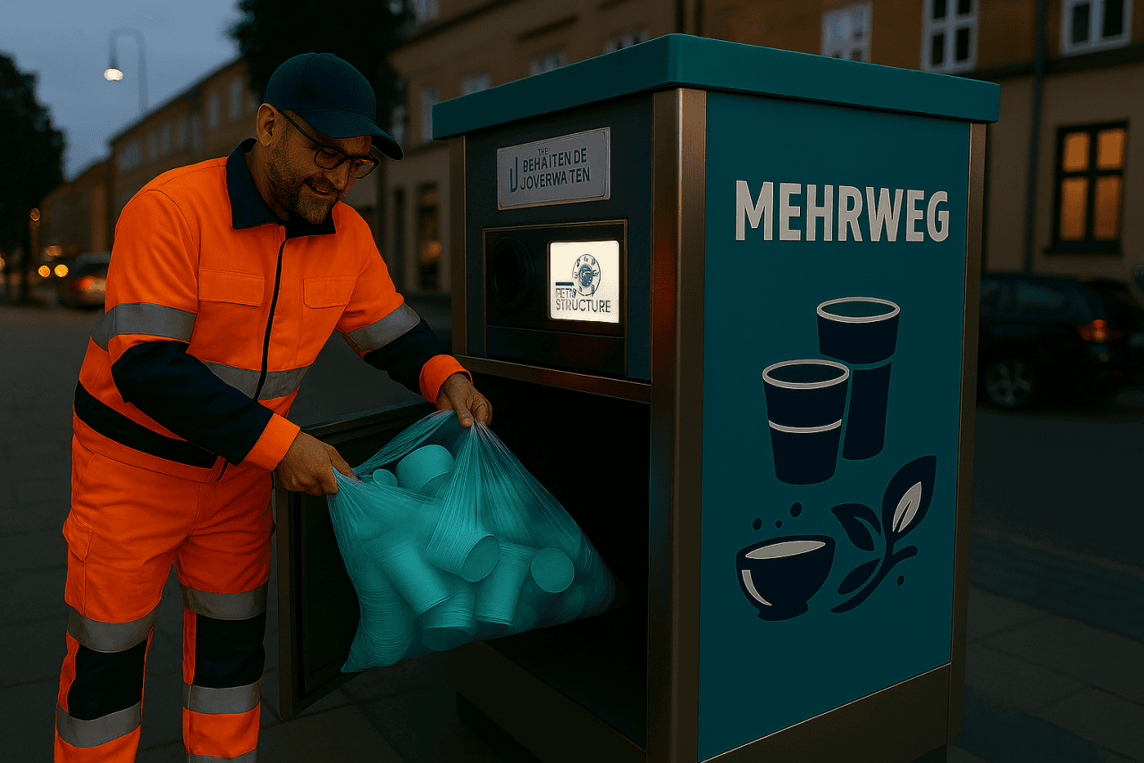 Eine städtische Mehrweginfrastruktur für diverse Stoffströme, umgesetzt durch eine Kooperation städtischer Betriebe und privater Unternehmen.